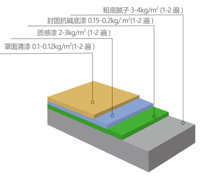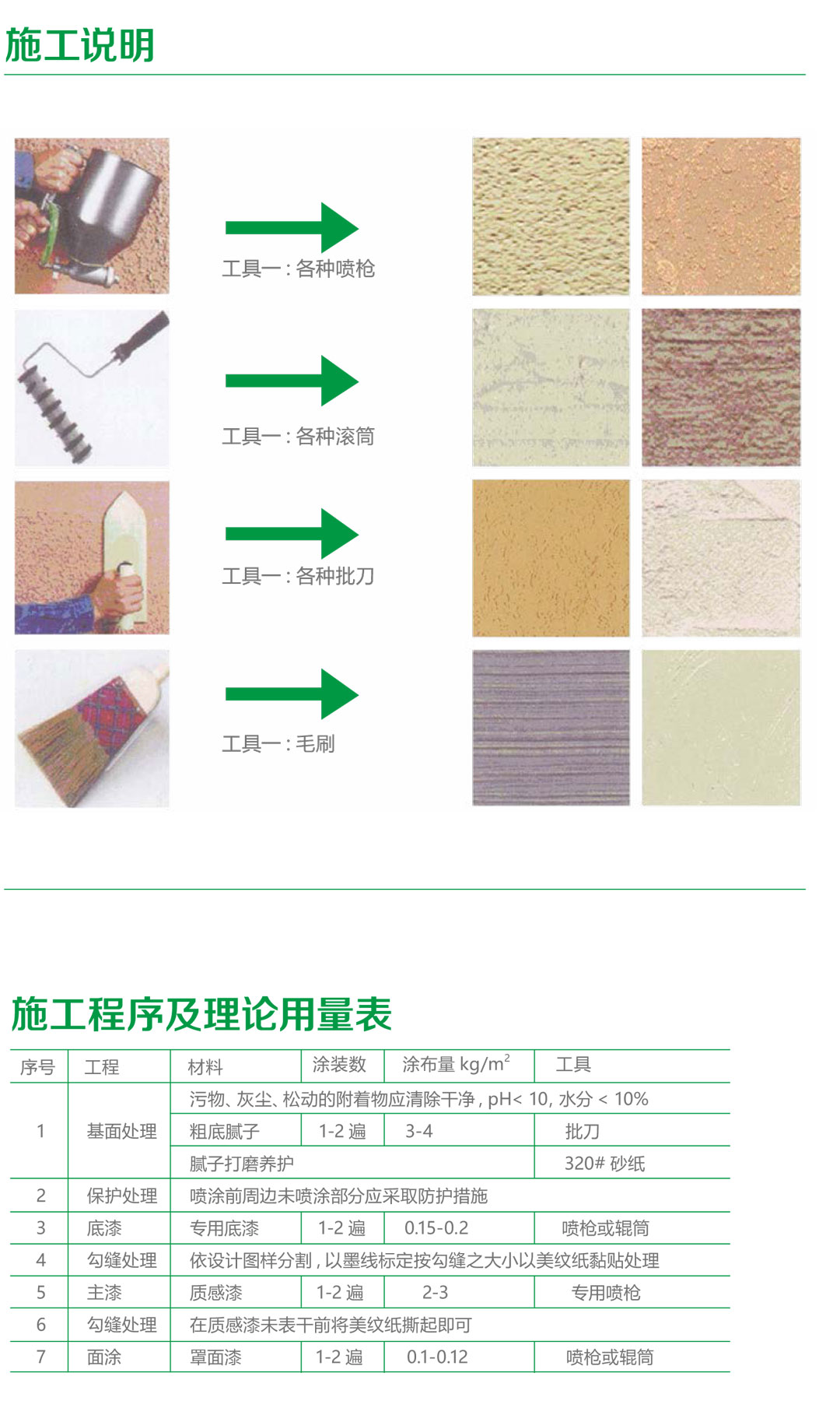 耗 漆 量 :理論值— 2-3kg/平方( 實(shí)際耗漆量會(huì)因施工方法、基層表面干硬程度和粗糙度及施工環(huán)境而有差異 )